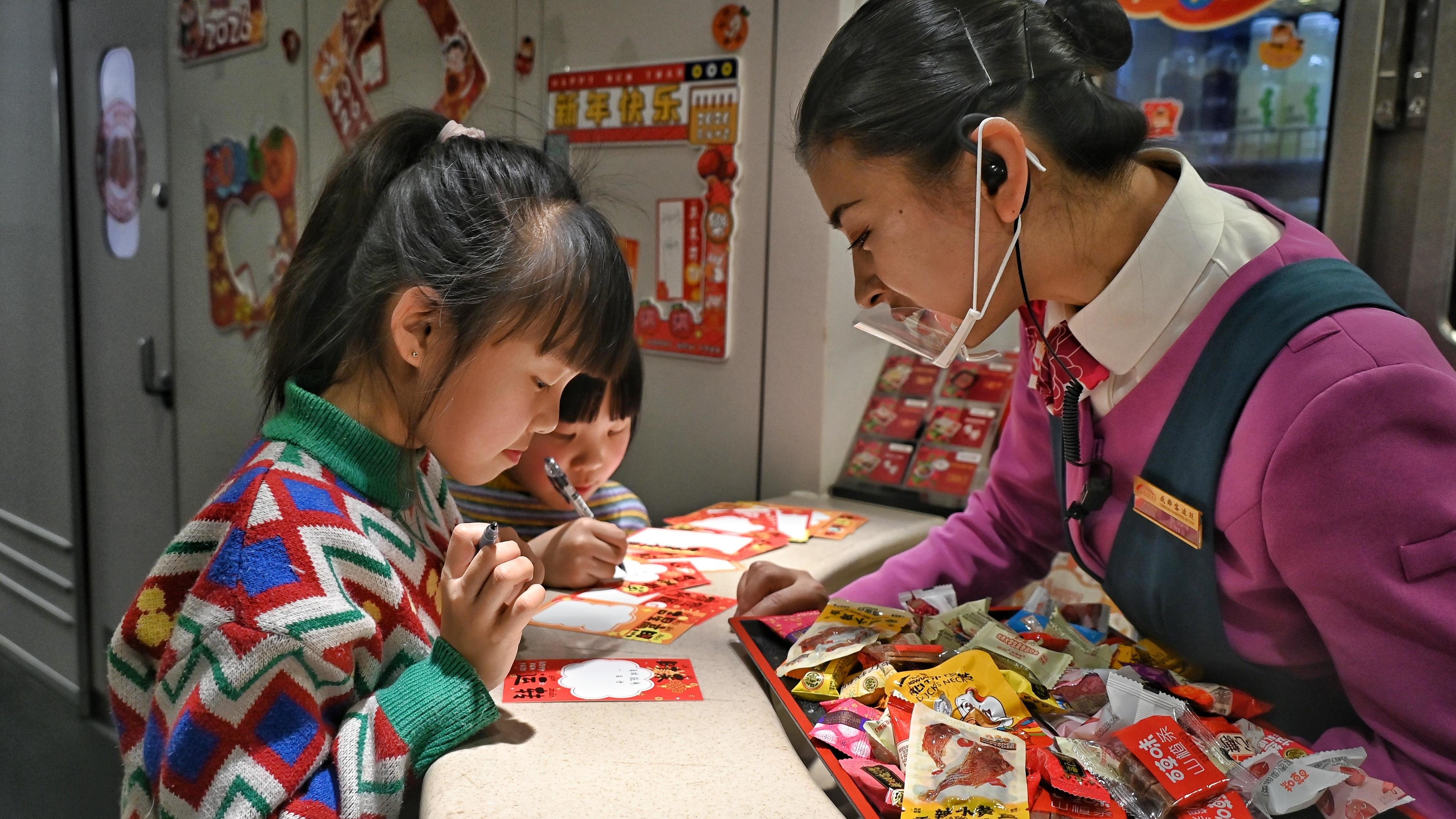 2月17日,成都东站开往九寨黄龙站的C5782次列车上,乘务员为旅客免费拍摄并现场打印新春全家福。该乘务组中有不少摄影爱好者,他们创新服务方式,将传统年俗与旅途服务结合,让春运服务理念从保障‘走得了’向‘走得好、走得暖心’转变。
