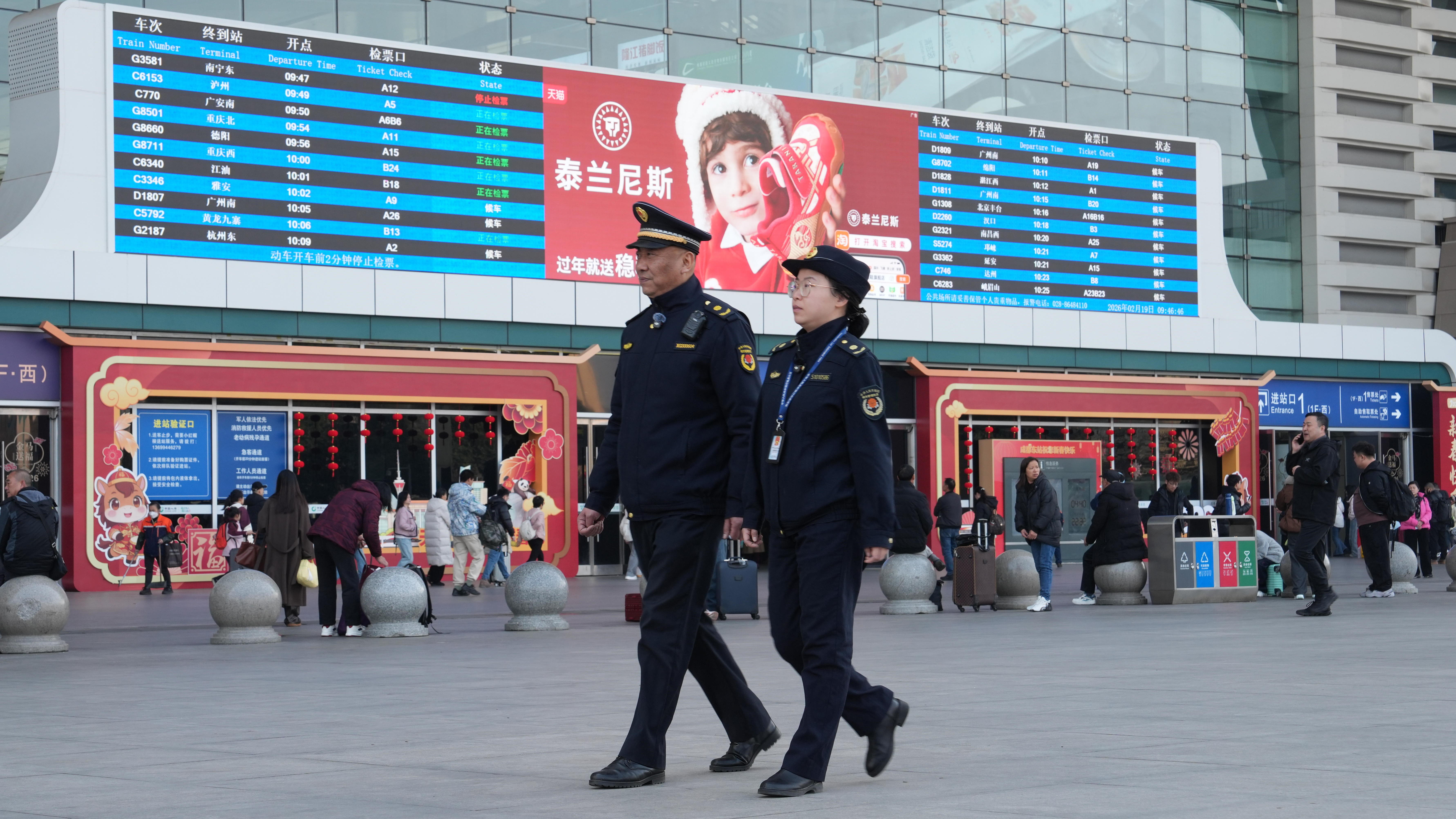 2月19日,成都东站迎来节中客流高峰,旅客吞吐量预计超过40万人次。成都市城管执法总队火车站支队在正月初三保持高强度值守,约三分之一执法人员在岗,维护站前广场市容秩序并提供问询引导服务,确保城市窗口整洁有序。尽管春节期间流动摊贩减少,城市管理标准未降低。随着春节旅游高峰持续,火车站支队将继续保障火车站外围秩序,让每位旅客留下美好印象。