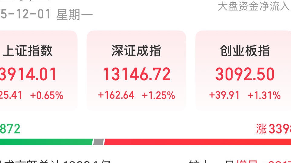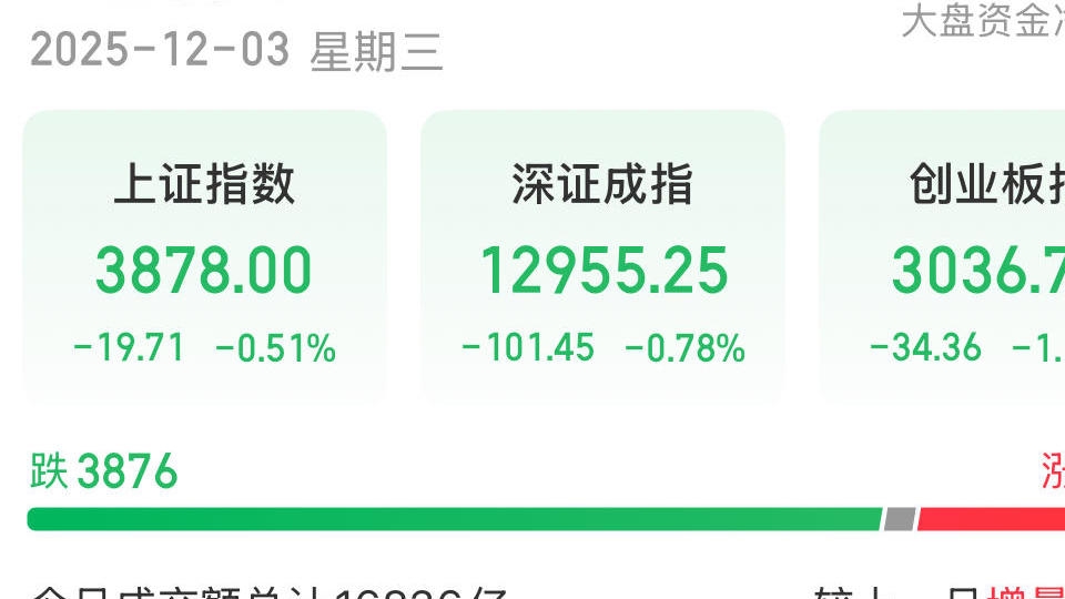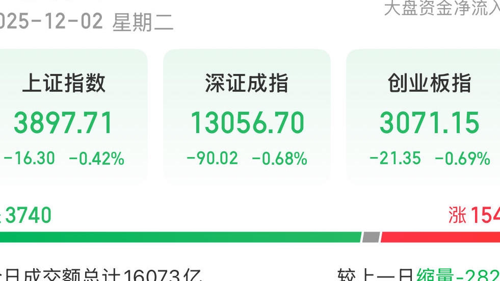 12月2日,A股三大指数集体调整,截至收盘,上证指数跌0.42%,收报3897.71点;深证成指跌0.68%,收报13056.70点;创业板指跌0.69%,收报3071.15点。