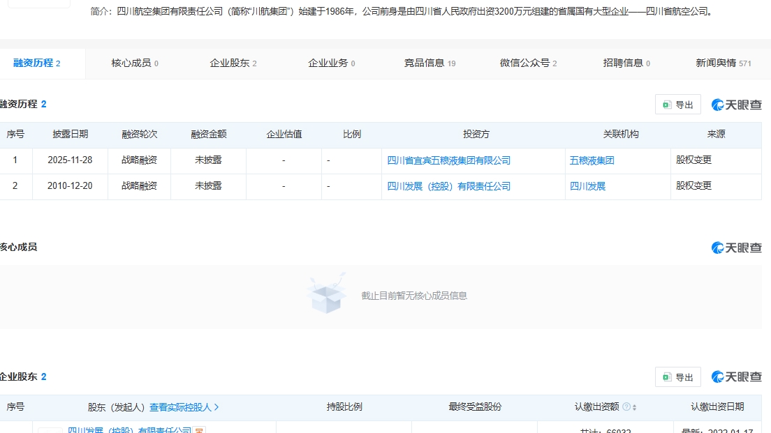 11月28日,四川航空集团有限责任公司完成工商变更,新增四川省宜宾五粮液集团有限公司为股东,五粮液集团持股45.8306%,成为川航集团第二大股东。此前,川航集团由四川发展全资控股,增资扩股后四川发展持股54.1694%。五粮液集团与川航集团此前已签署增资扩股协议,并将探索航空货运数智化业务,推动资源共享与业务协同。