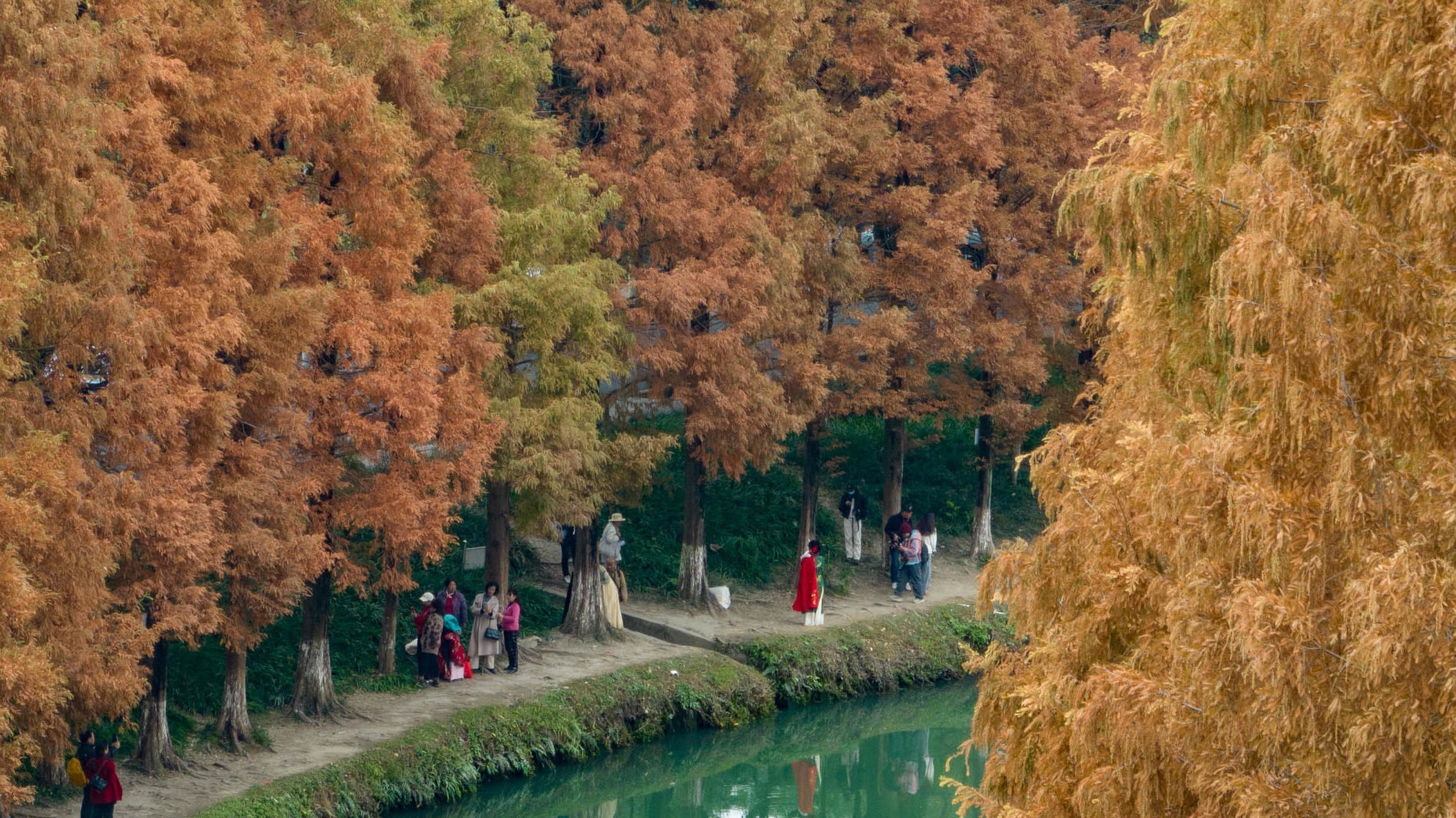 12月3日,成都升仙湖畔的水杉林进入最佳观赏期。绵延2公里的百余株水杉悄然换上 “红装”,橙红、浅黄与墨绿交织渐变,倒映在澄澈河面,宛如展开一幅浓墨重彩的冬日油画,吸引大批市民游客前来打卡。