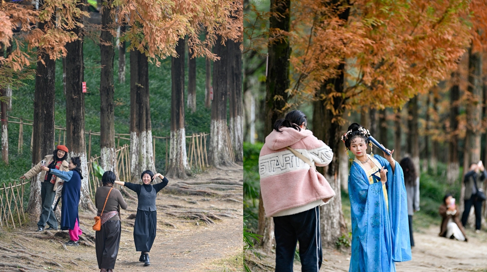 C视频丨成都升仙湖水杉林换“红装” 市民打卡冬日限定景观