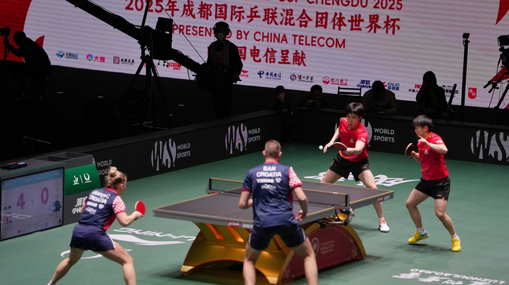 12月3日,中国乒乓球队在混团世界杯第二阶段比赛中以总比分8-0战胜克罗地亚队,取得四连胜。比赛中,王楚钦/孙颖莎、蒯曼和林诗栋均以3-0轻松获胜,展现了压倒性的实力。现场成都球迷热情助威,气氛热烈。