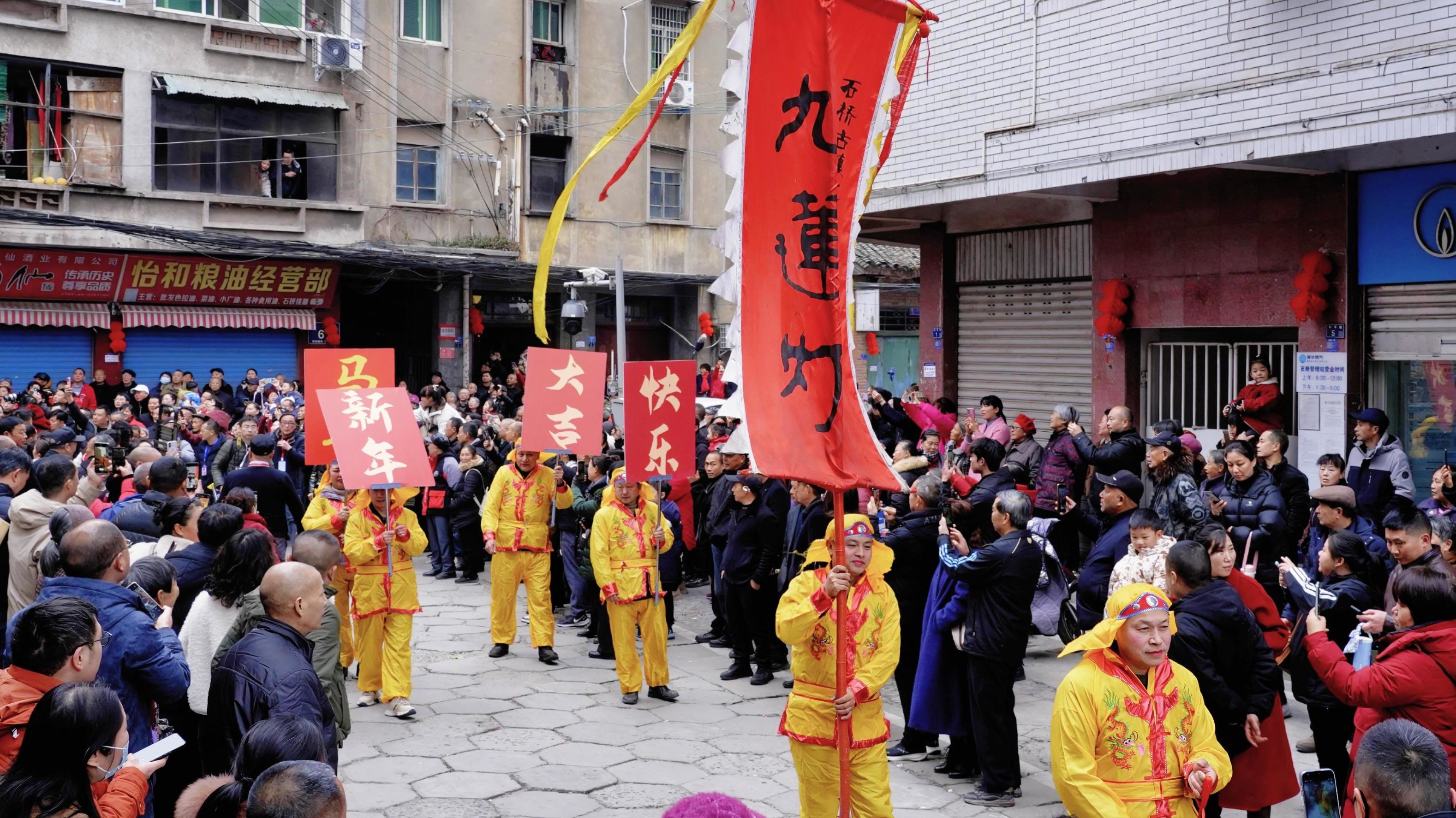 2月17日,农历马年正月初一,简阳市石桥古镇举行九莲灯等传统表演,燃起九盏油灯的壮汉们在锣鼓声中行进,祈求神灵宽恕、消灾免难。