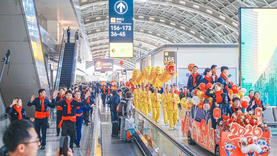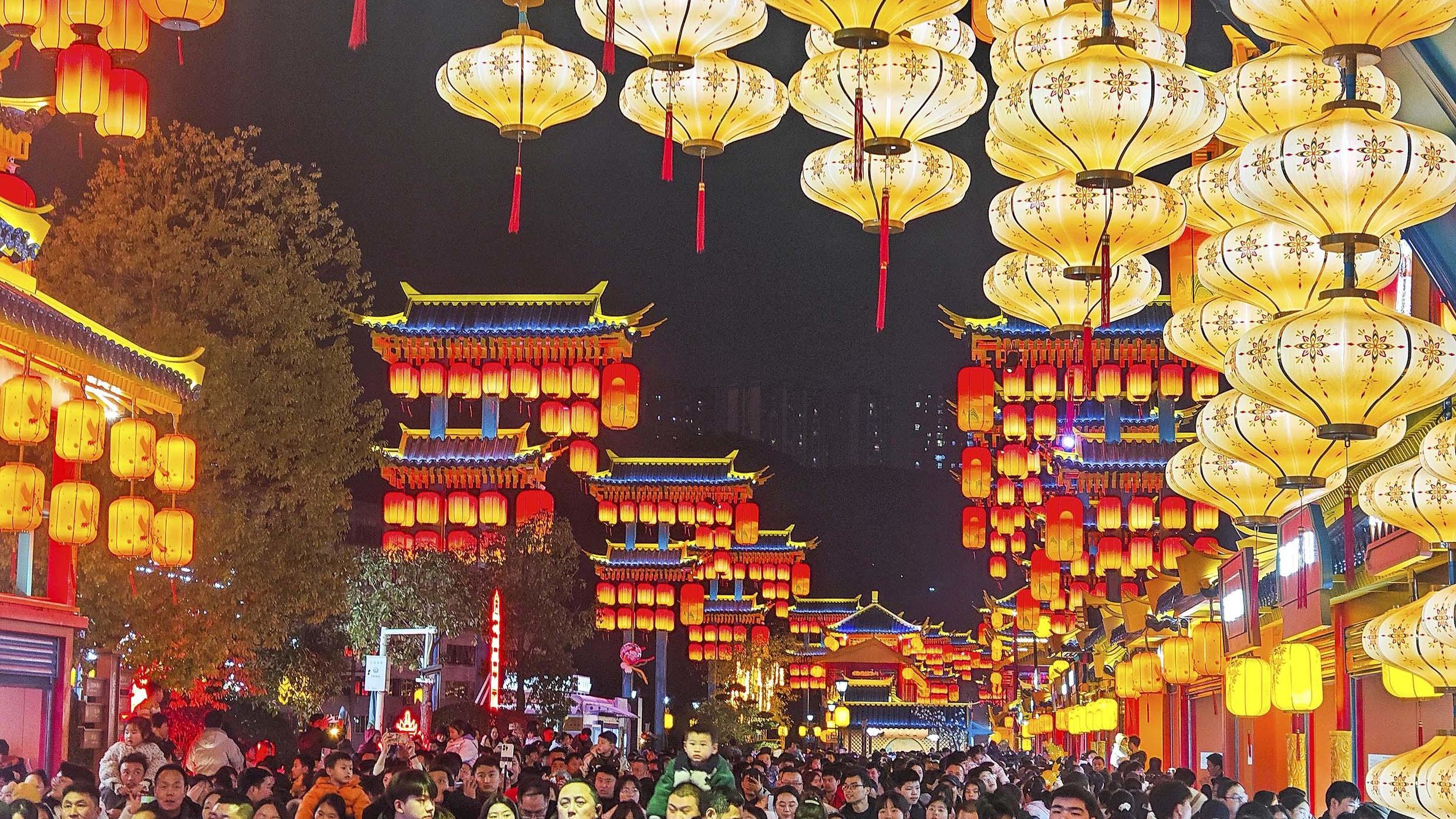 1月15日晚,成都龙湖东安天街内的一处绮梦新春鱼灯群阵成为热门打卡点,金色鱼灯悬挂排布形成流光溢彩的灯海。随着春节临近,成都各商圈将推出以传统文化元素创新表达的特色主题布置,营造浓厚节日氛围。